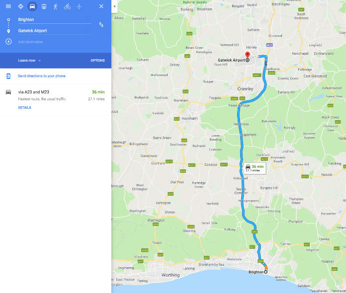 It takes around 36 minutes to drive from Brighton to Gatwick, while it’s between 25 and 41 minutes to get the train.