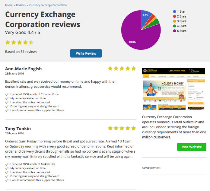 For instance, you can get $1,397.50 from Currency Exchange Corporation. They have 61 reviews and about 4.5 stars out of 5. When you click into their review section, you’ll see that the vast majority are five-star reviews from people who received a great service.