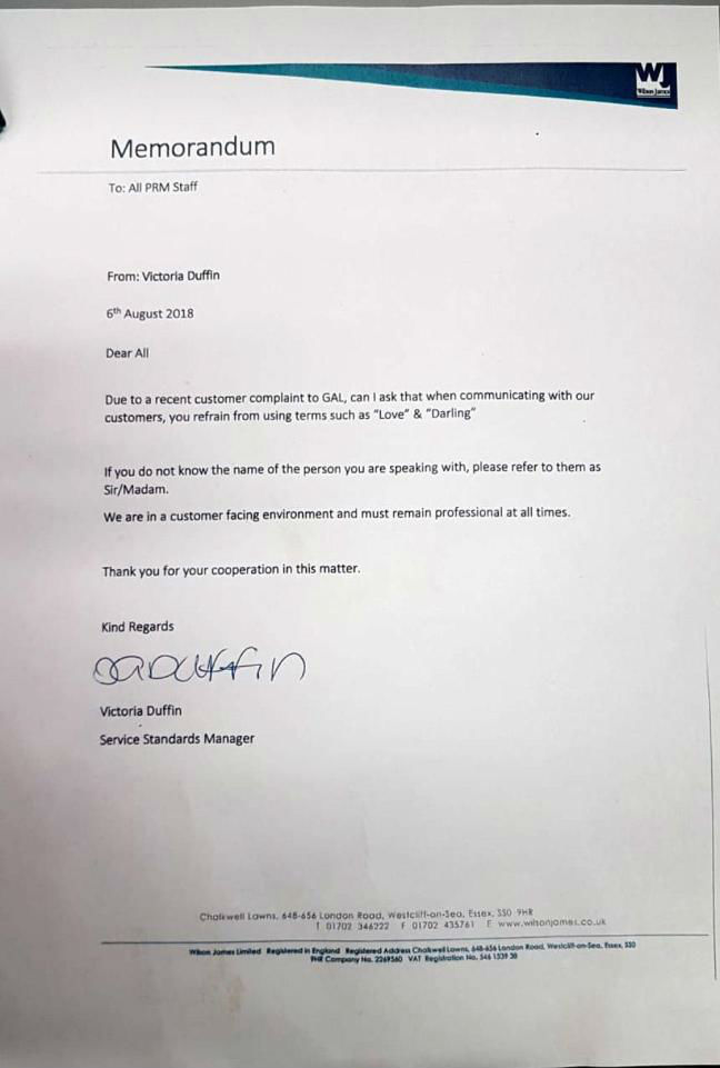 “Due to a recent customer complaint to GAL, can I ask that when communicating with our customers, you refrain from using terms such as “Love” & “Darling”.