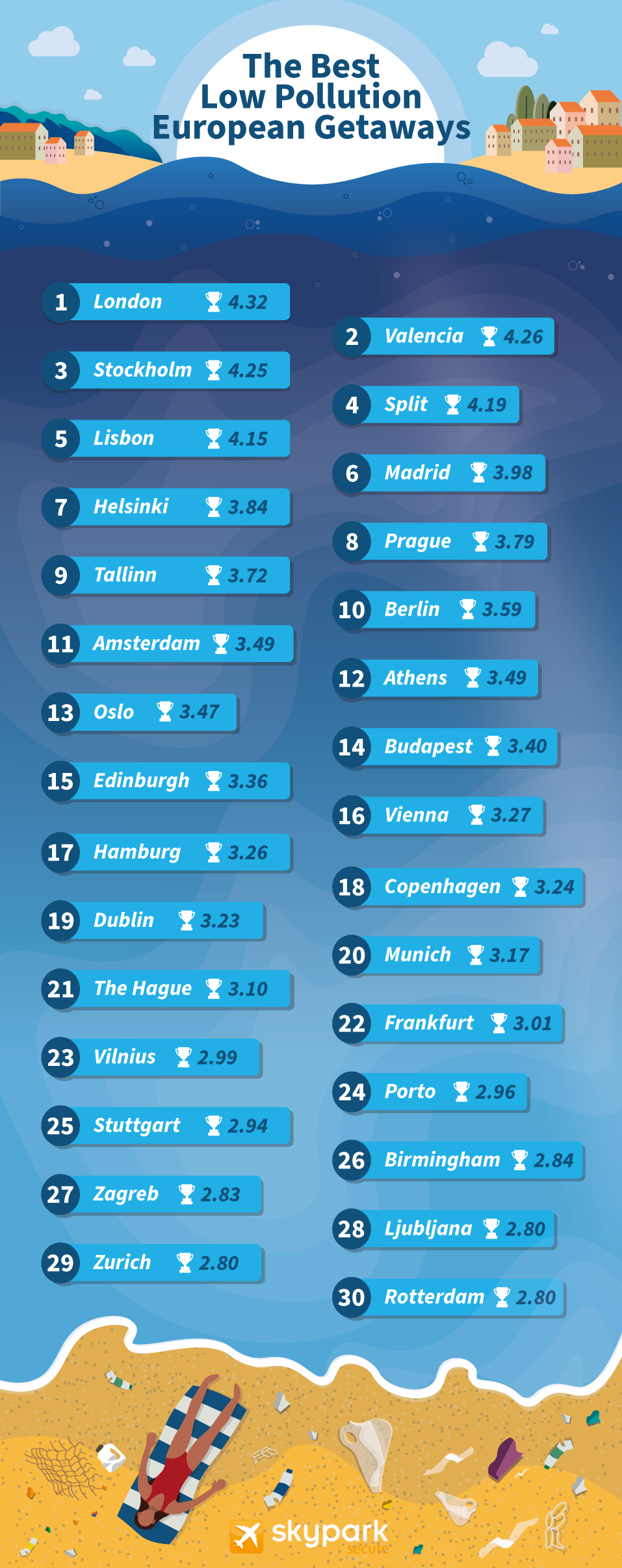 Using Numbeo’s pollution index, we took the top 50 European cities and analysed several factors. These included green space, noise pollution levels, hours of sunshine, the number of activities to do, and more. So, read on to discover the top 10 low pollution European destinations, as well as the best places to visit if you’re visiting as a family, or as a couple.
